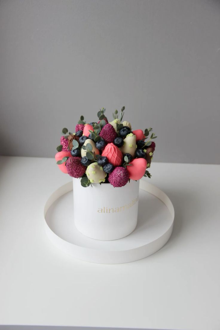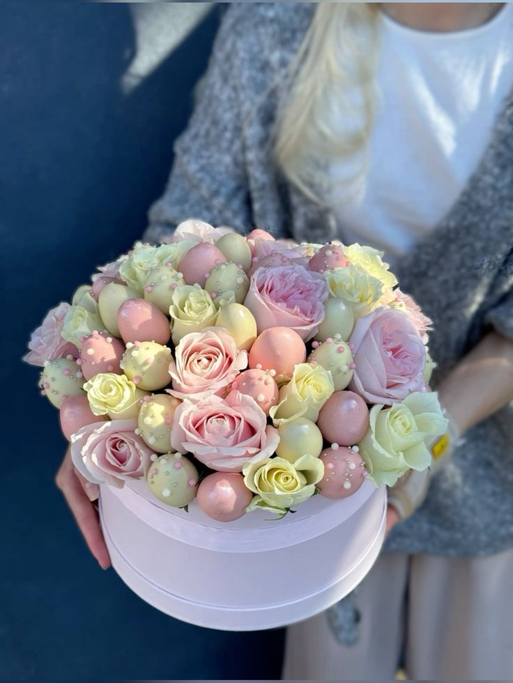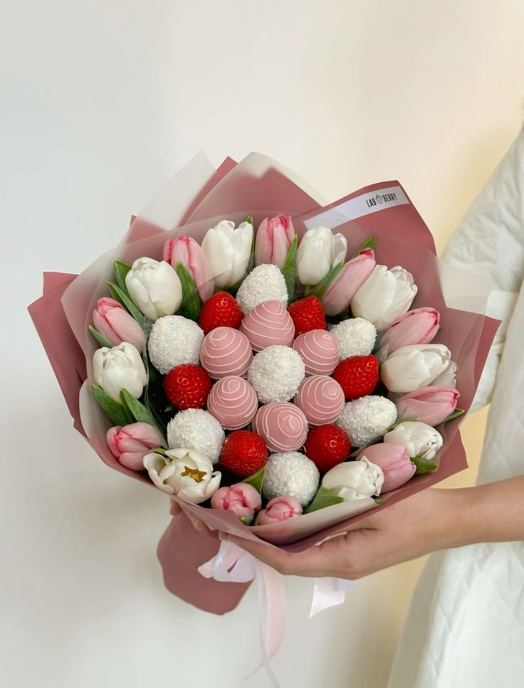 Why choose between flowers and sweets? Our twin bouquets blend fresh, crisp white tulips with artisan-decorated strawberries in shades of rose and cream. Wrapped pastel paper, it’s a whimsical, fresh-from-the-garden gift designed to brighten any day.