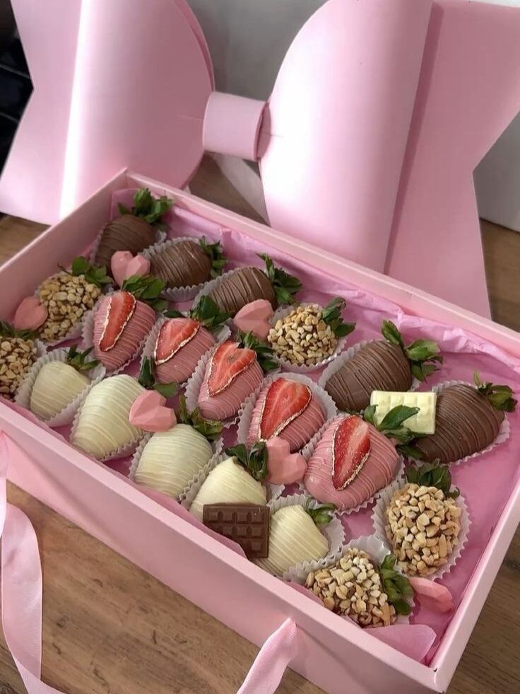 A curated collection of hand-dipped strawberries, featuring a harmony of white, milk, and ruby chocolate. Topped with crushed hazelnuts, this elegant pink box finished with our signature oversized bow—is the ultimate statement of luxury.